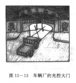 把光敏电阻装在大门上汽车灯光能照到的地方,把带动大门的电动机接在干簧管的电路中,那么夜间汽车开到大门前,灯光照射光敏电阻时,干簧继电器接通电动机电路,电动机带动大门打开(图15-13)。